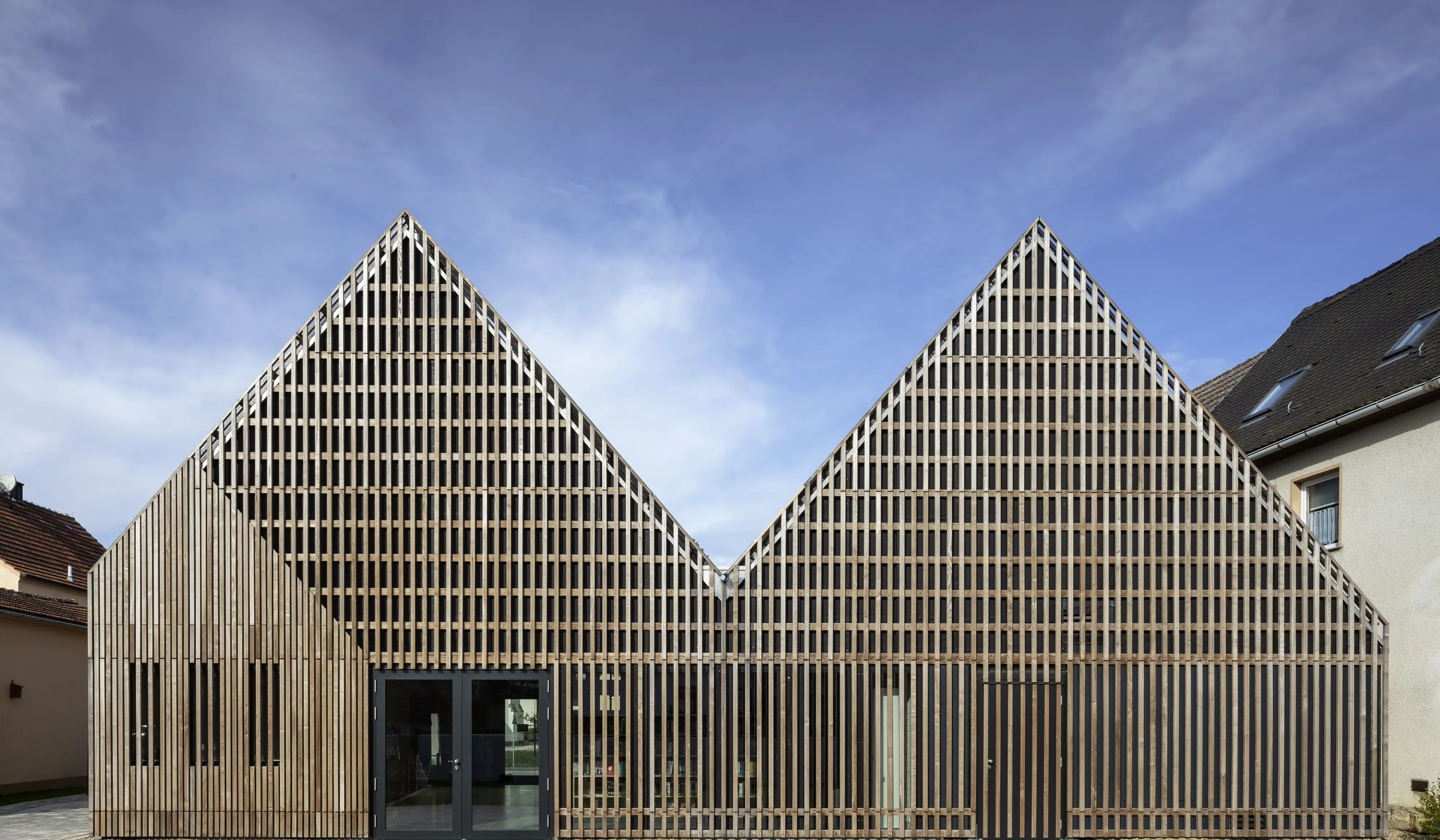 Egy meglévő, korábban szabadon álló parasztházat egy pajtával együtt gondosan felújítottak, és egy épületegyüttes részévé vált. Két részből álló faépítmény ad otthont az új közösségi könyvtárnak.
